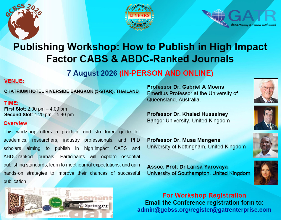 18th Global Conference on Business and Social Sciences (18th GCBSS) concurrent event workshop on ''How to Publish in CABS and ABDC Ranked Journals". The workshop is free for all registered 18th GCBSS guests.