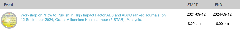 Workshop on ''How to Publish in High Impact Factor ABS and ABDC ranked Journals" on 12 September 2024, Grand Millennium Kuala Lumpur (5-STAR), Malaysia.
